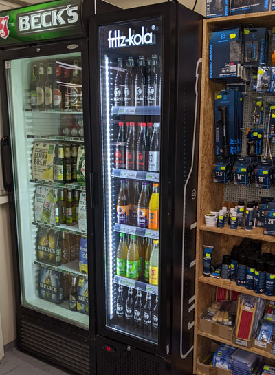 Mutmaßlicher Wermutstropfen an der Sache ist, dass der Kühlschrank etwas versteckt und fernab der eigentlichen Fritz-Platzierung in der Getränkeabteilung steht – andererseits gibt jeder dritte Kunde hier auch Leergut ab und kommt daher zwangsläuft an dem Kühler vorbei. Wird schon laufen.