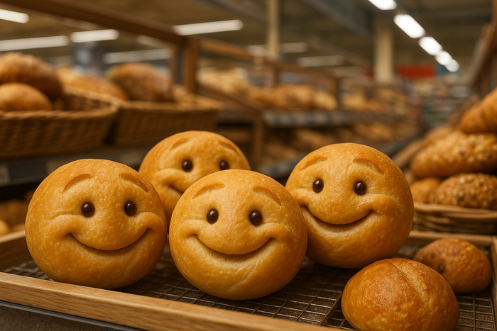 Keine Ahnung, welcher Schalk mich geritten hatte, aber die Steilvorlage musste ich natürlich auch mal wieder ChatGPT zum Fraß vorwerfen: "Hey, ich habe einen Bilderauftrag für dich: Wir haben einen Artikel im Sortiment, der sich "Gute Laune Weizenbrötchen" nennt. Sind natürlich nur langweilige Aufbackbrötchen – aber DU kannst da bestimmt ein richtig schickes lustiges Bild draus zaubern. Fotorealistisch und sehr detailreich gestaltet bitte in der Umgebung eines Supermarktes."