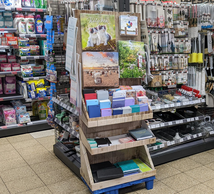 Eigentlich hieß es seitens unseres Haushaltswarenlieferanten, dass es die gemischten Displays mit Wand- und Taschenkalender nicht mehr gibt. Zumindest war das letztes und möglicherweise auch schon vorletztes Jahr so. Zu meiner großen Überraschung hatten nun vor ein paar Tagen doch wieder einen dieser Aufsteller bekommen.