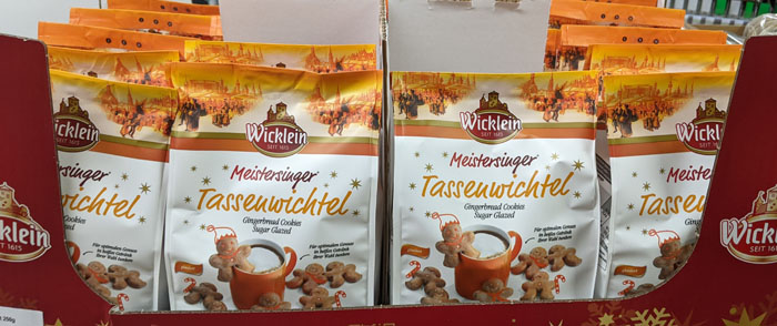 Die "Tassenwichtel" von Wicklein sind kleine Lebkuchen-Männchen, die man an den Rand eines Bechers oder einer Tasse stecken kann. So kann man dann die mit Tee, Kaffee, Milch, Glühwein, Gemüsebrühe, Cola, Eierpunsch, Bier oder was auch immer vollgeschlabberten Beinchen weglutschen.