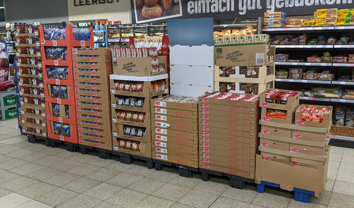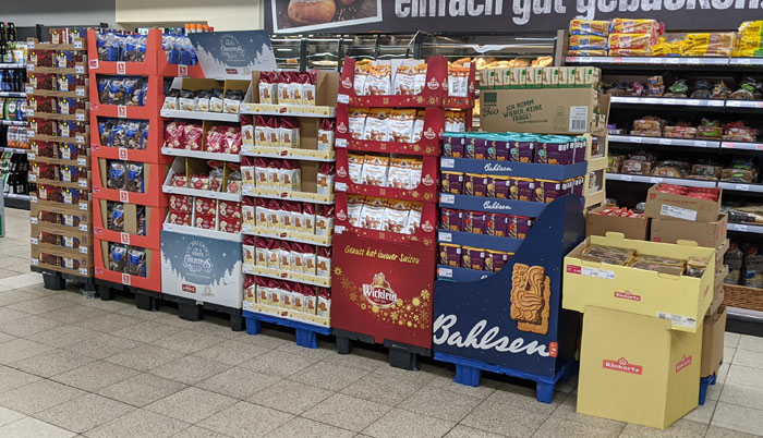 Nach der ersten Version durfte unser neuer Azubi mal kreativ werden (mit freundlicher Unterstützung durch seinen Ausbilder) und den Aufbau mit der Weihnachtsware neu gestalten. Nun sie die bunten Displays allesamt vorne, auf der Rückseite verstecken sich die hässlichen, braunen Kartons mit unseren Eigenmarken-Artikeln.