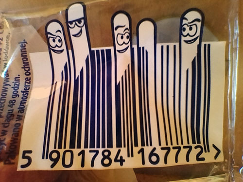 Fundstück von Honza auf einer Packung Snack-Salami von Berlinki: Ein Strichcode, aus dem die Salamis (frech grinsend) aus den einzelnen Strichen wachsen.