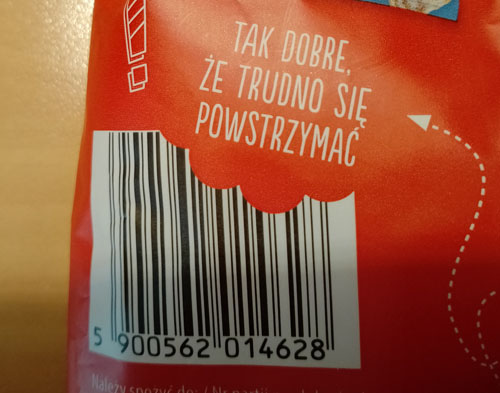 Die Idee eines an gebissenen Strichcodes ist nicht ganz neu, aber der Text daneben ("So gut, dass es schwer ist, aufzuhören") macht es lustig. Gefunden von Honza auf einer Packung "Salami Chips" von Sokolow aus Polen.