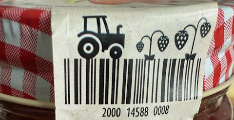 Auf dem Erdbeer-Fruchtaufstrich "Erdbeer-Traum" von Karls Erdbeerhof hat Alex diesen Strichcode mit einem Traktor und mehreren Erdbeerpflanzen entdeckt. Vielen Dank für die Zusendung des Fotos.