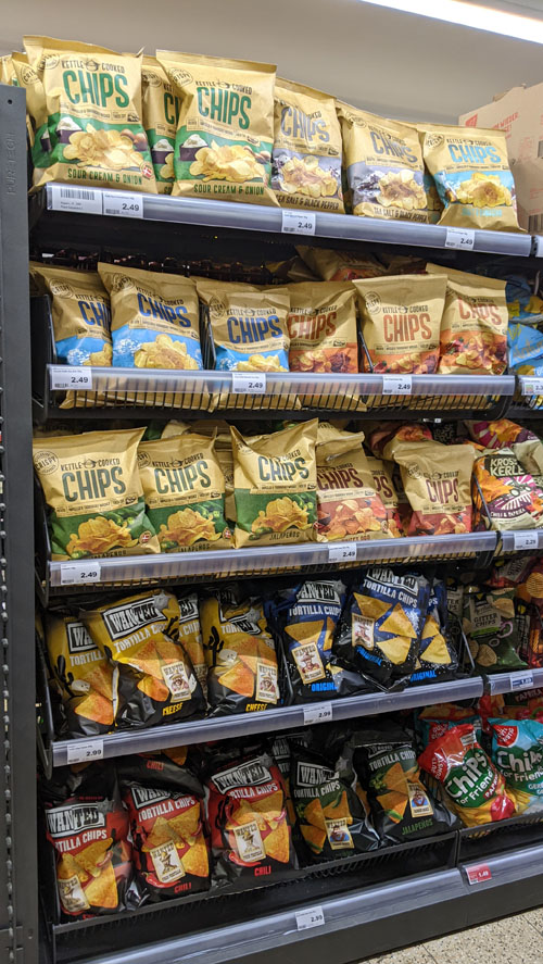 Seitdem sind diese Kesselchips in allen acht Sorten (und neuerdings auch noch vier Sorten Tortilla-Chips) fester Bestandteil unseres Sortiments. Bislang immer als Platzierung auf Paletten, aber seit ein paar Tagen mit einem kompletten Regalmeter bei uns im Chipsregal. Die OK-Chips haben sich bei uns zum Topseller gemausert und ich habe schon so oft unschlüssige Kunden probieren lassen, die dann sofort begeistert zugegriffen und teilweise mehrere Tüten gekauft haben.