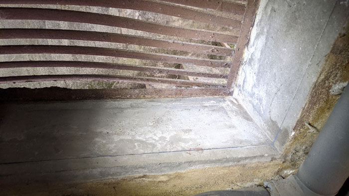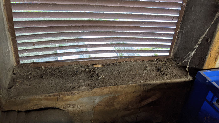 Erste Amtshandlung: Der Dreck muss weg, denn seit Jahrzehnten (dafür ist die Schicht doch noch erstaunlich dünn gewesen) hat sich auf den Vorsprüngen einiges angesammelt: