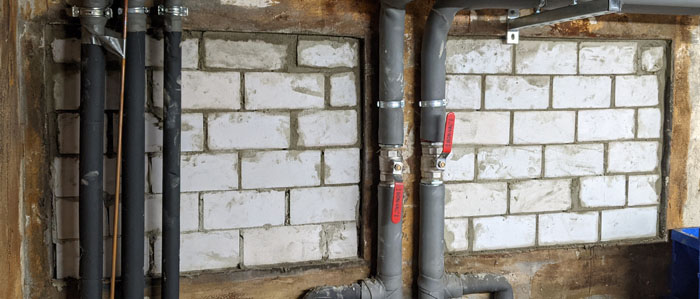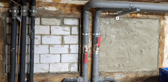 Danach bin ich in meine Arbeitshose geschlüpft und habe unten im Keller ein paar Dinge vorbereitet: Bluetooth-Lautsprecher aktivieren, Steine bereitlegen, Mörtel anrühren. Nun liegen auch schon die ersten Steine in der rechten Lüftungsöffnung und das linke Loch schließt sich langsam.