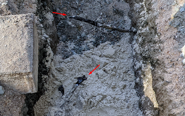 "Kaputt" war sehr treffend. Die Zuleitung zu unserem Gebäude bestand neuerdings aus zwei Teilen (die beiden Enden sind im Bild mit roten Pfeilen markiert). Ist aber auch eine miese Kabelqualität, wenn man das mit einem Hydraulikbagger einfach so zerpflücken kann.