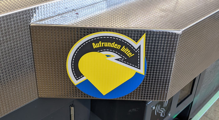 Im Kassenbüro hatte ich noch einen Umschlag mit Werbematerial für die Aktion "Aufrunden bitte!" gefunden. Es handelte sich dabei lediglich um Aufkleber, die ohne einen Hinweis auf einen möglichen Verwendungszweck auf diese Aktion hinweisen sollen. Diese habe ich nun allesamt bei uns im Kassenbereich verteilt.