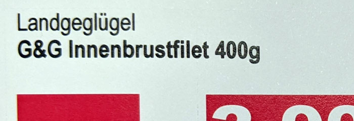 Da hat sich wohl irgendjemand bei der zentralseitigen Artikel- und Stammdatenpflege vertippt. Das "g" sitzt auf einer Standardtastatur nun einmal neben dem "f" und da reicht schon ein kleiner Abrutscher und schon ist aus dem Geflügel das Geglügel geworden. Sollte einem vielleicht auffallen, immerhin ist das nicht ein profaner Blogeintrag, sondern ein Regaletikett, das in vielen Märkten Verwendung finden sollte, war es aber offenbar nicht.