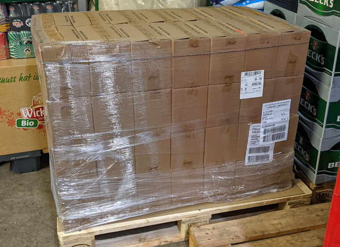 Wie jedes Jahr können wir in der Weihnachtszeit neben den "Danke"-Schokoladentafeln mit Edeka-Aufdruck auch die Lindor-Kugeln als lose Ware bestellen, um auch diese als Dankeschön an der Kasse zu verteilen. Wir waren damit immer zurückhaltend, aber seitdem wir wieder Lindt auch fest im Sortiment haben, habe ich keine Gewissensbisse, ein paar mehr von den roten Schokokugeln aus dem Hause Lindt zu bestellen. Auf der Palette stehen 56 Kartons (á 3 kg Inhalt), insgesamt hatten wir aber 60 bestellt und auch geliefert bekommen. Die restlichen vier Schachteln standen zum Zeitpunkt des Fotos noch irgendwo zwischen der Ware unserer Hauptlieferung.