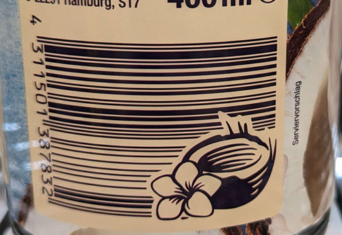 Strichcode-Fundstück von Ines auf unserer Eigenmarken-Kokosmilch der neuen "Herzstücke"-Marke: Ein Strichcode mit einer aufgeschlagenen Kokosnuss, daneben eine Blüte, die aber keine Kokosblüte ist, sondern eine Frangipani-Blüte, die auch gerne im Zusammenhang mit Kokosprodukten abgebildet wird: