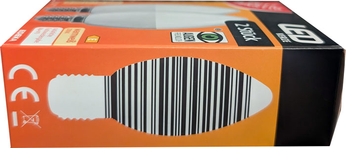 Fundstück auf einer Zweierpackung LED-Kerzenlampen unserer Eigenmarke: Ein Strichcode in Form einer Kerzenlampe mit E-14-Fassung, dazu fast in Originalgröße: