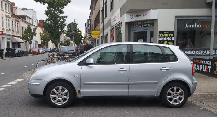 Endlich wieder Slalomtraining auf dem Gehweg! Danke an den Hobby-Parkkünstler (ohne DH-Kennzeichen, ein Wunder!), der den Passanten heute diese sportliche Extraeinheit spendiert hat.