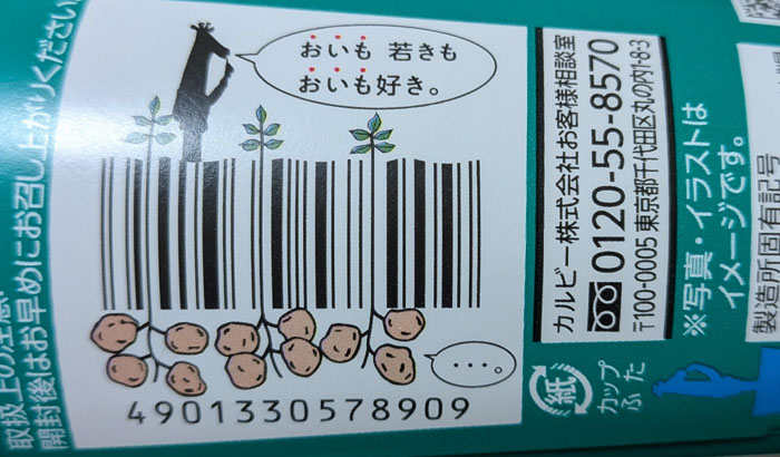 Vielen Dank an Thomas für die Zusendung dieses Strichcodes mit vielen Süßkartoffeln und einer Giraffe, die Süßkartoffeln liebt, den er auf einem Becher "Calbee Jagariko Potato Stick Snacks" aus Japan entdeckt hat.