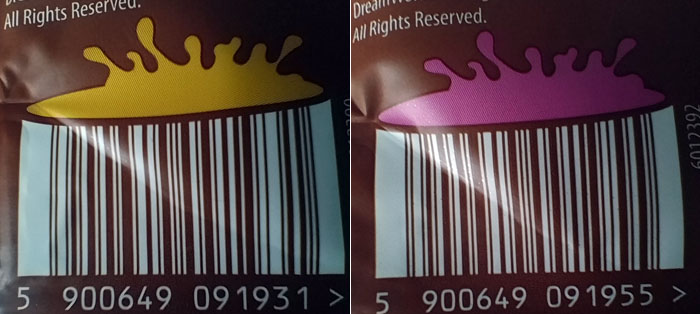 Auf den Schokodrinks von Mokate hatte Honza diesen Strichcode mit Spritzern entdeckt. Je nach Sorte (Himbeere oder Banane) in pink oder gelb gefärbt. Vielen Dank für die Zusendung.