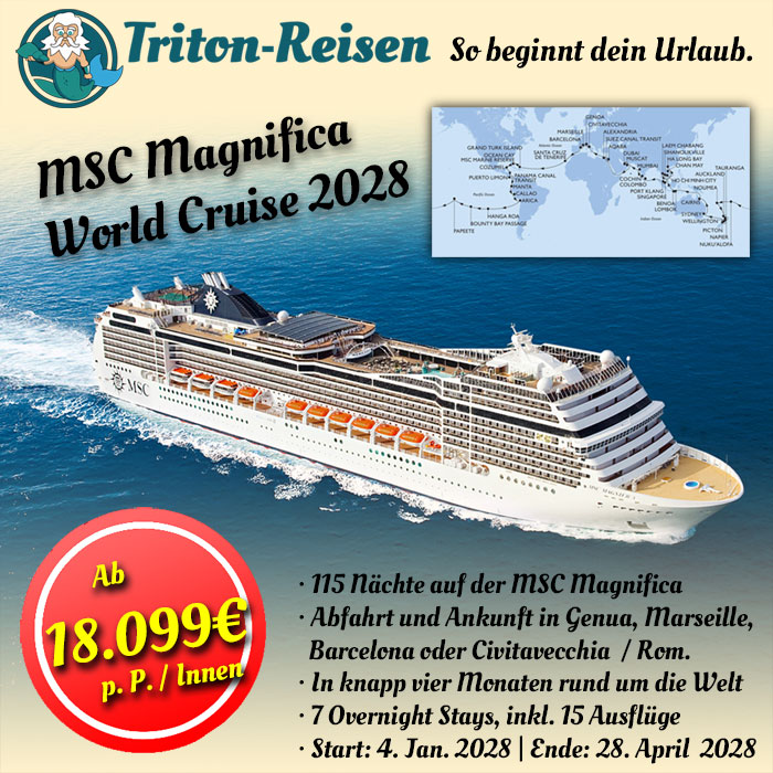 Viele träumen davon, einmal um die Welt zu reisen. Mit der MSC World Cruise 2028 auf der MSC Magnifica ist dieser Traum nun zum Greifen nahe.