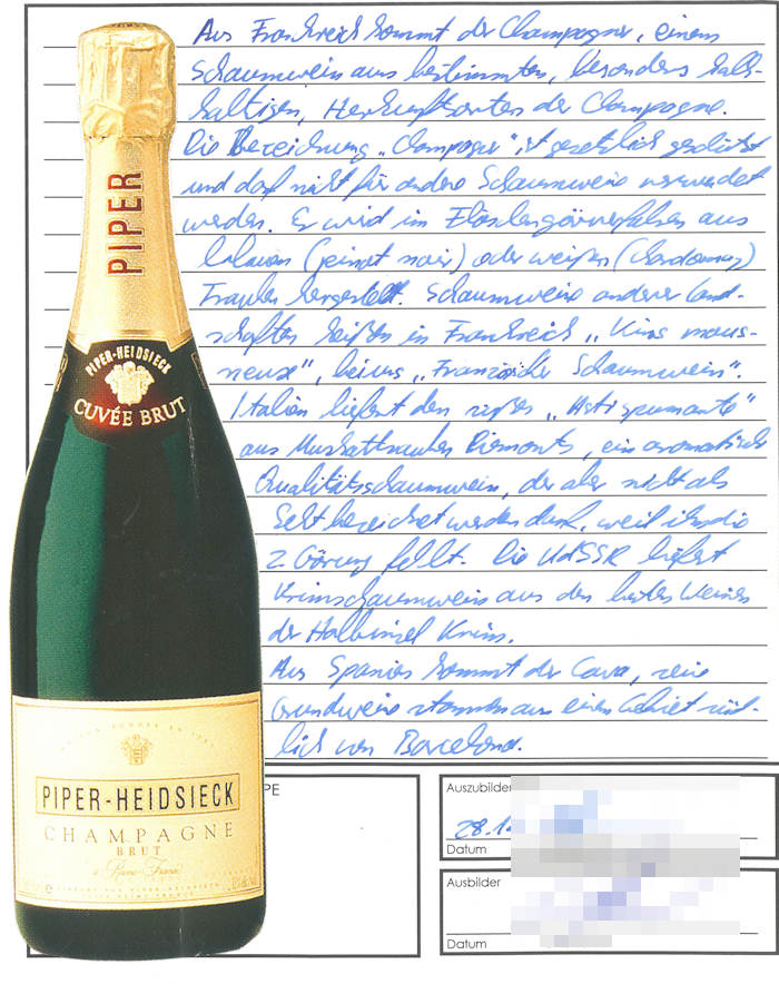 Aus Frankreich kommt der Champagner, einem Schaumwein aus bestimmten, besonders kalkhaltigen, Herkunftsorten der Champagne. Die Bezeichnung "Champagner" ist gesetzlich geschützt und darf nicht für andere Schaumweine verwendet werden. Er wird im Flaschengärverfahren aus blauen (pinot noir) oder weißen (chardonnay) Trauben hergestellt. Schaumweine anderer Landschaften heißen in Frankreich "Vins mousseux", bei uns "Französischer Schaumwein".