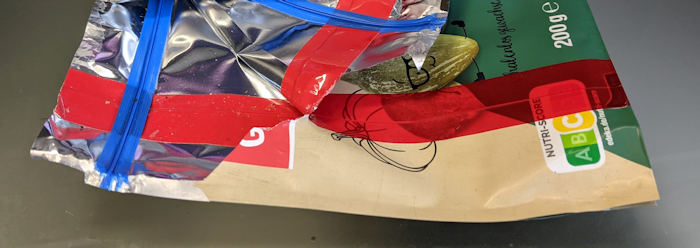 In Wirklichkeit hat die Packung gar keiner geflickt. Da waren zwei Bahnen der Folie miteinanderverbunden, aus welcher die Tüten für die Kürbiskerne produziert werden. :-P
