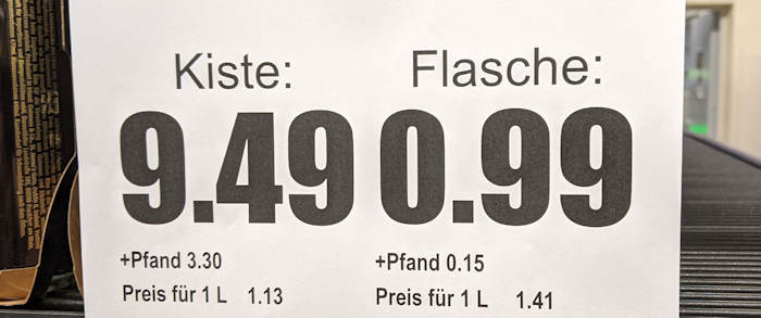 A4-Preisschild bei uns in der Getränkeabteilung. Links ist der Kistenpreis, rechts der für eine einzelne Flasche angegeben. Durch die große Schrift und den kleinen Abstand zwischen den Preisen ergibt sich auf den ersten Blick eine recht unübersichtliche Zahlenkolonne.