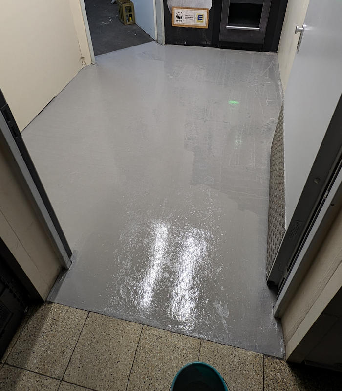 Wenn man hier schon rund um die Uhr Videoaufzeichnung laufen hat, kann man diese ja auch für ein paar lustige Dinge nutzen. Als es gestern Abend an den Anstrich des Fußbodens im Leergutraum ging, kam eine gewisse Hektik auf.