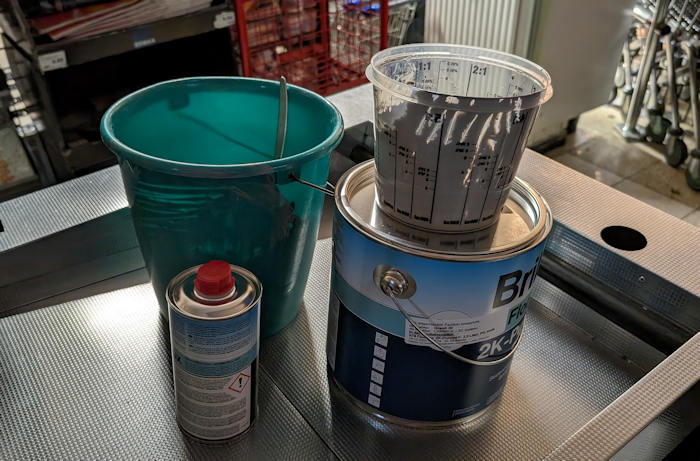 Die beiden Komponenten für die Fußbodenfarbe und auch den Verdünner hatten wir genau abgemessen. Bei diesem Material wollten wir die Komponenten nicht "Pi-mal-Daumen" zusammenkippen, sondern uns exakt an die vorgegebenen Mischungsverhältnisse halten. Wir hatten zwar auch einen Messbecher, aber mit der Waage geht sowas einfacher. Die einzigen Waagen hier im Markt stehen an der Kasse – also mit allem Geraffel auch nach vorne.
