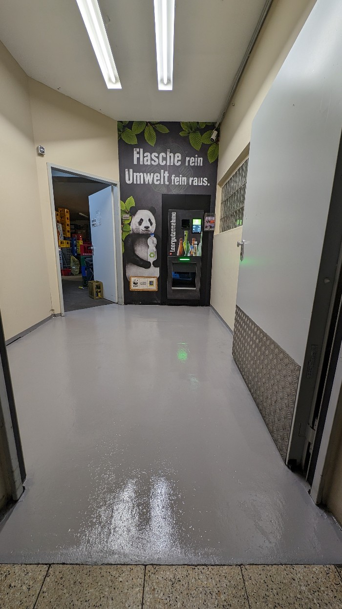 Um 0:44 Uhr heute Nacht waren die Arbeiten abgeschlossen. Der Raum vor dem Leergutautomaten ist komplett neu gestrichen, nun kann die Farbe bis Mittwoch Morgen in Ruhe trocknen, resp. aushärten, da es ja eine 2K-Farbe ist.