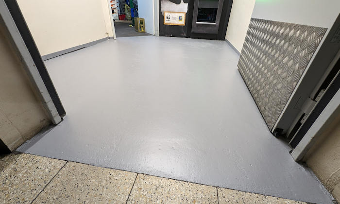 Die Farbe im Leergutraum war nun nach der ersten Nacht schon so weit trocken, dass nichts mehr klebte. Vorsichtig auf Socken hätte ich mich durchaus getraut, darauf zu laufen. Musste aber ja nicht sein und so geben wir dem Material nun noch bis Mittwoch Morgen Zeit zum aushärten.