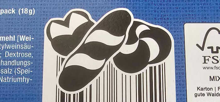 Der Kornmühle "Mini Laugen-Mix" von Netto besteht aus jeweils fünf Laugenstangen, Laugensemmeln und Laugenknoten. Diese finden sich passenderweise auch im Strichcode wieder.
