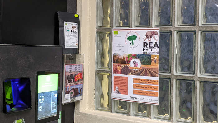 Für den REA-Weihnachtskaffee habe ich von der Rösterei einen Plakatentwurf bekommen. Außer bei uns in den Rahmen am Schaufenster haben wir auch einen Ausdruck an die Glasbausteine neben dem Leergutautomaten geklebt. Da weiß man dann direkt, was es mit der "abgestellten" Packung auf der Elepfandspendenbox auf sich hat. :-)