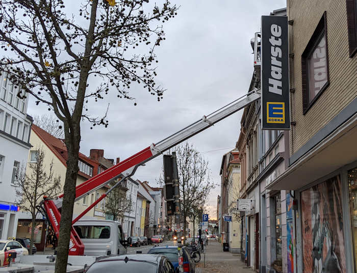 Nicht nur die Zaunbauer haben sich angekündigt, um den nicht mehr funktionierenden Ausleger unserer Außenwerbeanlage wird sich heute auch gekümmert. Ein Elektriker, der mit der Webefirma zusammenarbeitet, ist mit einer Hebebühne angerückt und begutachtet die Anlage derzeit.