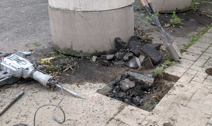 Herausforderungen für unsere Zaunbauer, aber das war vorher schon klar: Sie müssen durch den Asphalt und werden darunter sicherlich noch die eine Überraschung in Form alter Mauern oder gefliester Fußböden finden. Zwei Trennscheiben mit Viertaktmotor und zwei schwere Stemmhämmer werden das Kind schon schaukeln. Wir sind bestimmt nicht die ersten Kunden, bei denen im Boden nicht nur Sand und Erde zu finden ist.