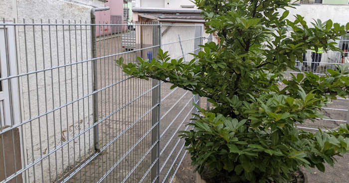 Noch mehr Gitter beim Blick aus dem Fenster meines Büros … Aber immerhin ist das Grün näher an die Scheibe gerückt, das gleicht sich dann wieder aus.
