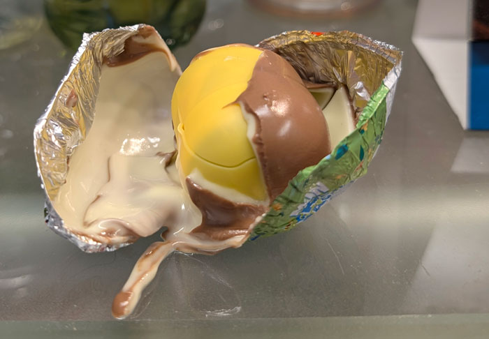 Grundsätzlich fühlte sich die Raumtemperatur hier im Büro gar nicht so warm an, aber der warme Luftstrom aus meiner Klimaanlage im Wärmepumpenbetrieb strich wohl die ganze Zeit genau in die Richtung. Als ich eine Weile später wieder zu dem Ei guckte, staunte ich nicht schlecht. Dass Schokolade in der Heizungsluft mal weich wird, kommt vor. Aber dass sich so eine eiförmige Kinderüberraschung gleich fast komplett auflöst, hatte ich bis dato auch noch nicht erlebt …