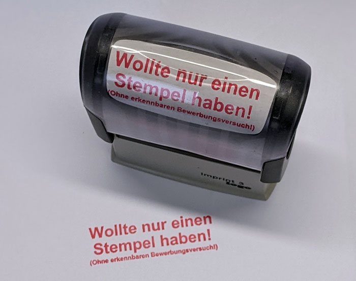 Dem Steuerzahler in mir war damals der Kragen geplatzt und so hatte ich diesen Stempel in Auftrag gegeben, allerdings habe ich ihn nie verwendet. Danach kamen noch ein- oder zweimal Leute vorbei, die aber tatsächlich zumindest halbwegs sowas wie eine Bewerbung im Gepäck hatten, da wäre dieser Stempel unfair gewesen. Entweder kam dann zufällig einfach niemand mehr bei uns vorbei oder das Konzept mit diesen Stempel-Listen wurde grundsätzlich abgeschafft, jedenfalls war der Stempel schlagartig obsolet geworden.