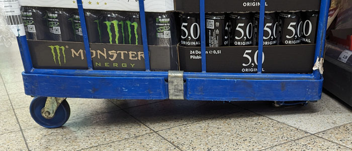 So ein Rollbehälter voller Getränkedosen liegt hinsichtlich seiner Gesamtmasse in Kilogramm knapp im mittleren dreistelligen Bereich. Dass das Fehlen einer Rolle, ob nun abgebrochen oder schlichtweg umgeknickt, die Handlichkeit eines solchen Gefährts deutlich verringert, kann sich vermutlich jeder selber ausmalen.