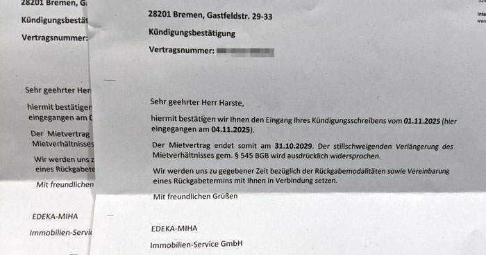 Also nicht physikalisch. Wir müssen nicht ausziehen, ich muss meinen Laden hier nicht aufgeben, alles liquidieren, die Mitarbeiter auf die Straße setzen. Aber die Mietverträge zwischen mir und der Edeka sind nun offiziell zum 31.10.2029 gekündigt. Das war's. Also in knapp vier Jahren erst. Aber dennoch!