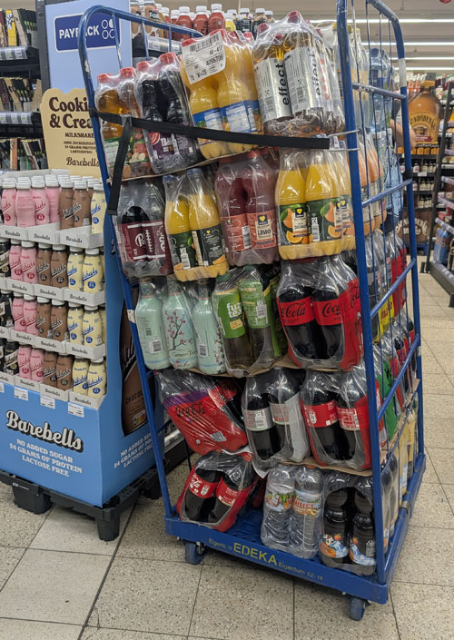 Manchmal ist man ja schon froh, wenn die gelieferte Ware nicht schon auf dem Weg durch den Laden krachend vom Rollbehälter fällt. Im Zeitalter von PET-Flaschen im Regal, wäre das mutmaßlich zwar keine allzu große Sauerei geworden, aber zum einen ist auch das Aufsammeln von Flaschen unnötige Arbeitszeit und zweitens hätte einem davon auch etwas auf den Fuß fallen können.