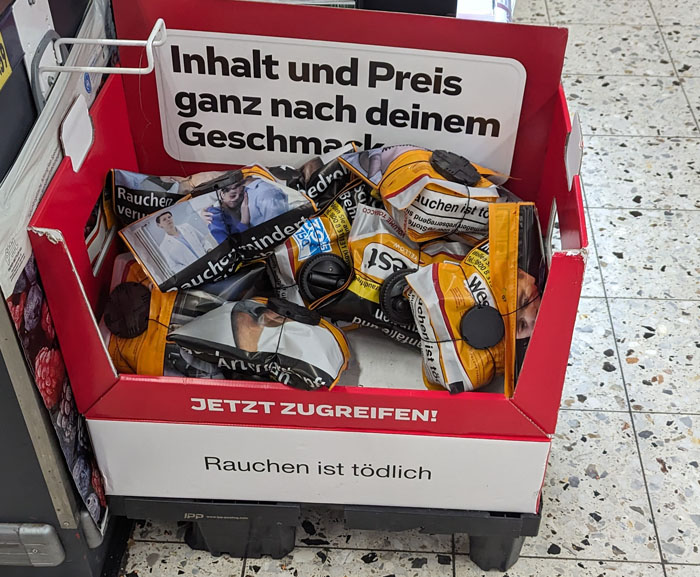Mehr als einen Monat später steht das Gelumpe dort immer noch herum, inzwischen war einer der Eimer sogar umgefallen und der Haufen verteilt sich in der Einfahrt. Stört sowas niemanden? Offenbar nicht – aber das Problem, dass sich in Mietshäusern niemand so richtig zuständig fühlt, kenne ich ja von unserem eigenen Gebäude hier. Wobei ich hier bei uns die eine Hälfte es Beirats der Hausgemeinschaft bin und mich um sowas längst mal notfalls selber gekümmert hätte.