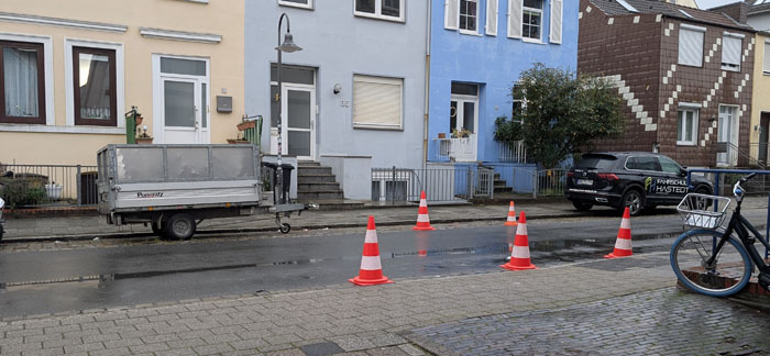 Die Behälter mit dem "vergessenen" Bauschutt hatte ich vor über einem Monat bereits von unserem Hof entfernt und neben die Garageneinfahrt des Hauses gestellt, an dem die Arbeiten von dem Maurer durchgeführt worden sind. Dabei hatte ich sogar eine Anwohnerin angetroffen, die der dort zuständigen Hausverwaltung Bescheid sagen wollte.