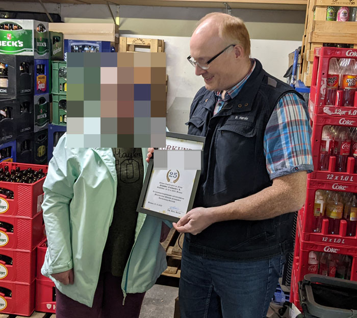 Gestern gab es bei uns im Markt ein seltenes und bislang einzigartiges Ereignis: Eine Mitarbeiterin hat tatsächlich 25 Jahre bei mir durchgehalten. Die Übergabe der obligatorischen Urkunde erfolgte selbstverständlich wie immer standesgemäß im Luxusambiente unseres Leergutlagers zwischen leeren Cola- und Bierkisten – edler wird es leider nicht.