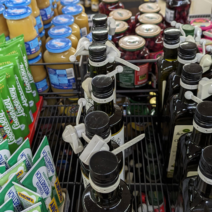 Es ist wirklich wichtig, dass die Flaschenzippel alle gleich orientiert an den Flaschen angebracht werden. Standard bei uns: Das eigentliche Tag mit dem Schwingkreis für die Antennen sitzt rechts, das Bändchen zeigt nach hinten. Wer auch immer diese Olivenölflaschen gesichert hat, hatte seine Einweisung jedenfalls nicht durch mich bekommen oder war mindestens an diesem Tag ziemlich schusselig.
