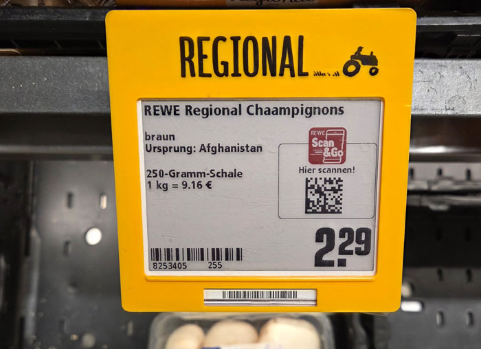 Fundstück von Casten in einem REWE-Markt: Ein leuchtend gelber "Regional"-Hinweis an einem ESL-Etikett, auf dem Cha(a)mpignons aus Afghanistan angeboten werden. Das Thema mit den regionalen Produkten wird auch beim rot-weißen Mitbewerber groß geschrieben und wie ich hier schon philosophierte, ist die Definition einer wie auch immer gearteten Regionalität natürlich immer sehr individuell.