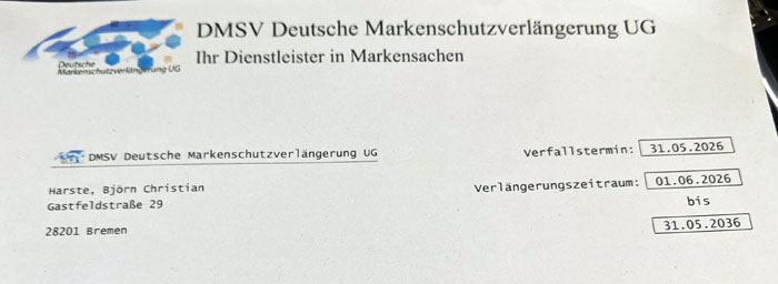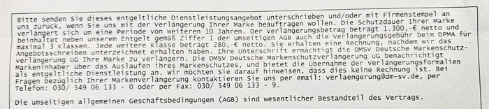 Diese "DMSV Deutsche Markenschutzverlängerung UG" hat mit dem DPMA gar nichts zu tun, auch wenn sie so tun als wenn sie mit denen zu tun hätten. Es ist ein privatwirtschaftliches Unternehmen, das einem die (sehr geringfügige) Arbeit abnimmt, eine Marke zu verlängern. Dafür kassieren sie, das unübersichtliche Kleingedruckte (unten zu sehen) offenbart es schon, 1300 Euro zzgl. Umsatzsteuer – ziemlich genau das Doppelte vom Preis beim Deutschen Patent- und Markenamt.