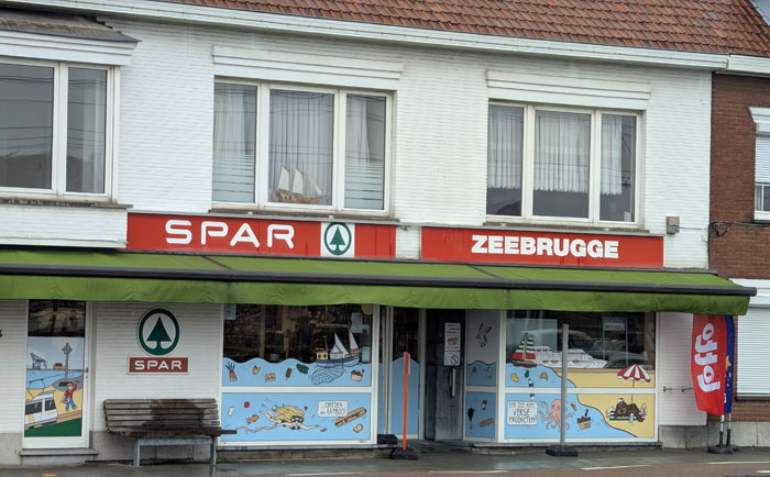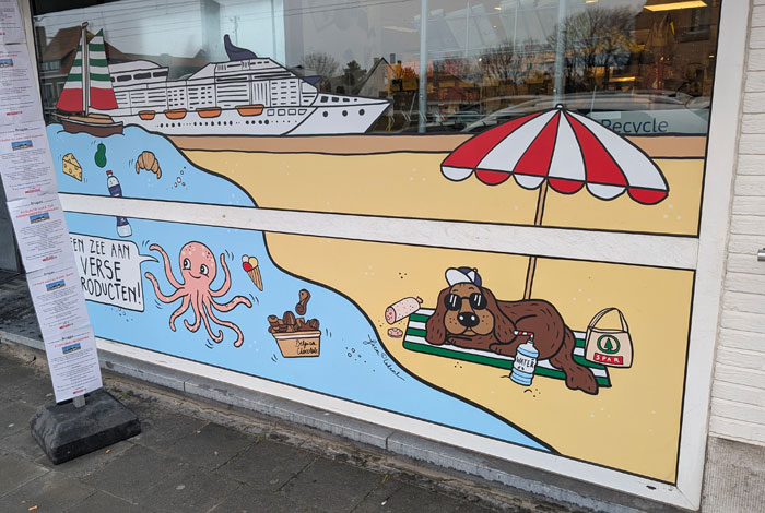 Die Schaufenster wurden im Laufe der letzten zwei Jahre neu beklebt. Die typischen großflächigen Lebensmittelfotos sind verschwunden, stattdessen ist jetzt eine etwas skurrile Zeichnung mit Krake und Hund am Strand zu sehen. Wichtig war wohl das Kreuzfahrtschiff, immerhin ist das Kreuzfahrtterminal in Zeebrugge nur ein paar Gehminuten von dem kleinen Laden entfernt.