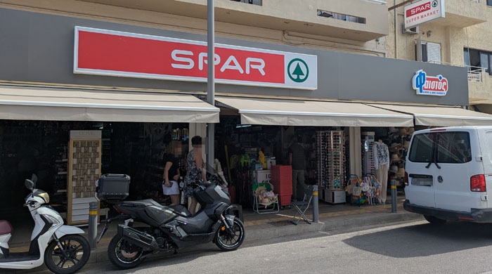 An der Nordküste Kretas gibt es nur wenige Meter vom Meer entfernt diesen SPAR-Markt, den Martin dort entdeckt und fotografiert hat. Der Markt befindet sich im Örtchen Limenas Chersonisou und schwebt mit seinem Sortiment irgendwo zwischen Touristen-Artikel im vorderen und einem klassischen Supermarkt im hinteren Bereich.