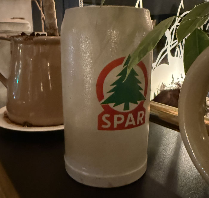 Im etwa vier Kilometer von dem SPAR-Express entfernt liegenden Restaurant "New Luc" (Street View) steht ein vermutlich relativ zufälliges Exponat: Ein Bierkrug mit aufgedrucktem SPAR-Logo. Der Gestaltung des Logos nach zu Urteilen müsste der Krug etwa aus den späten 50er-Jahren des letzten Jahrhunderts stammen. Warum auch immer der dort in dem Restaurant herumsteht.