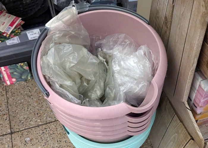 Man kann die Folie, die beim Verräumen der Ware angefallen ist, auch einfach in die zum Verkauf bereitstehenden Eimer stopfen (und dort erfolgreich vergessen), statt sie hinten im Lager in den Sack für Folie zu stopfen.