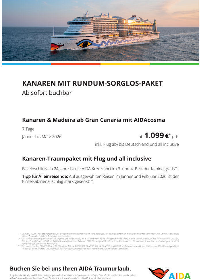 Das gilt für viele Nordeuropa-, Kanaren- und Mittelmeer-Reisen von April bis Oktober 2026 sowie für einige AIDAcosma Termine im Februar. Wer also ohnehin nächstes Jahr eine Kreuzfahrt mit Nachwuchs auf einem Schiff von AIDA plant, kann jetzt noch ein paar Euro sparen.