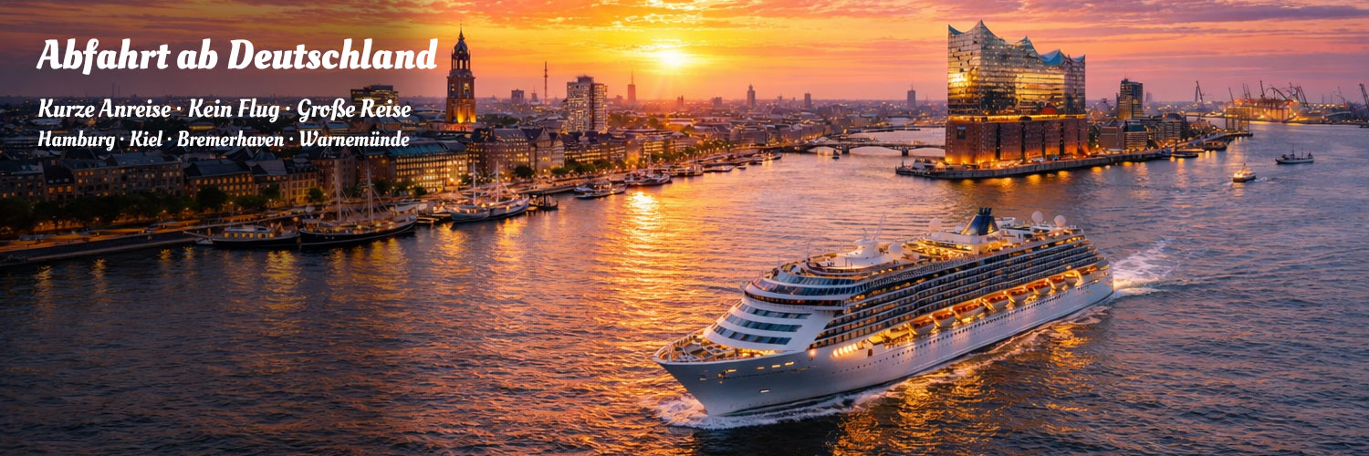 Bequem mit dem Auto oder dem Zug anreisen und ohne Flug von Deutschland aus in den Urlaub auf dem Schiff starten – mit vielen Abfahrten ab Hamburg, Kiel, Warnemünde, Bremerhaven, Cuxhaven und Travemünde findet sich immer die passende Reise.